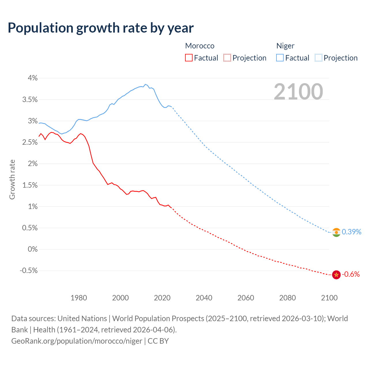 - For the last 10 years, Morocco has had an average growth rate of +1.09% per year vs +3.5% in Niger.