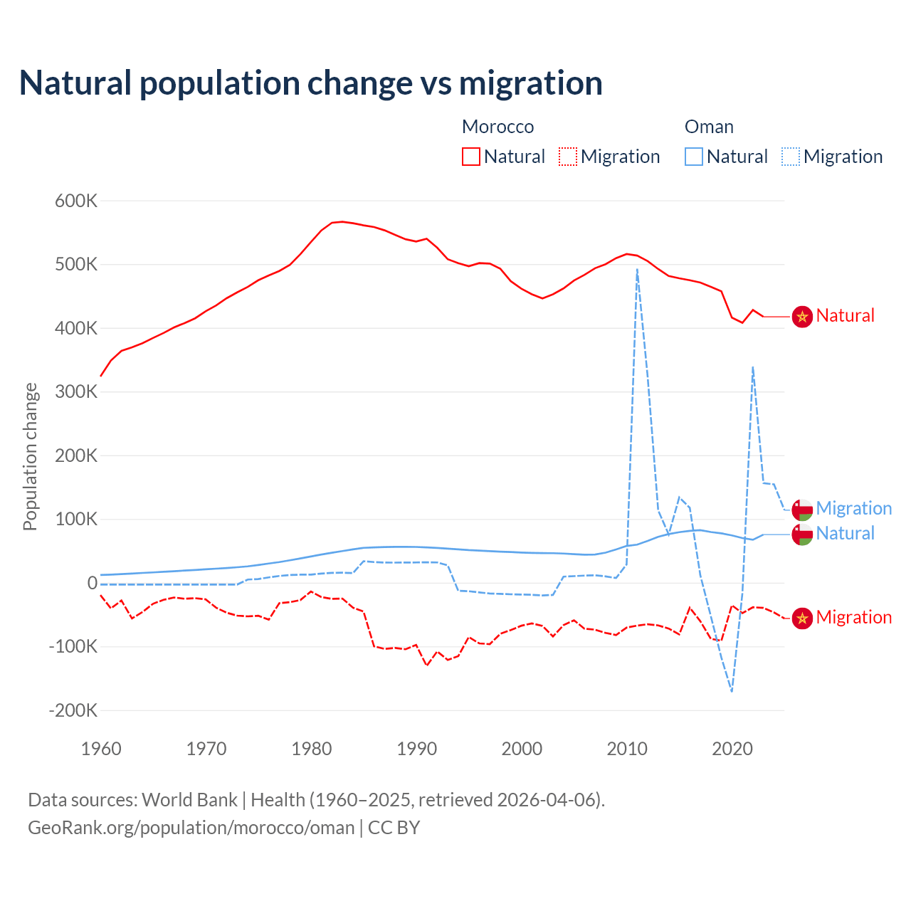 Over the last 10 years, 88.3% of the population change in Morocco is from natural causes (a gain of 4,495,223 people) and 11.7% is from migration (a loss of 594,083 people). In Oman 61.6% is from natural causes (a gain of 763,049 people) and 38.4% is from migration (a gain of 475,565 people).