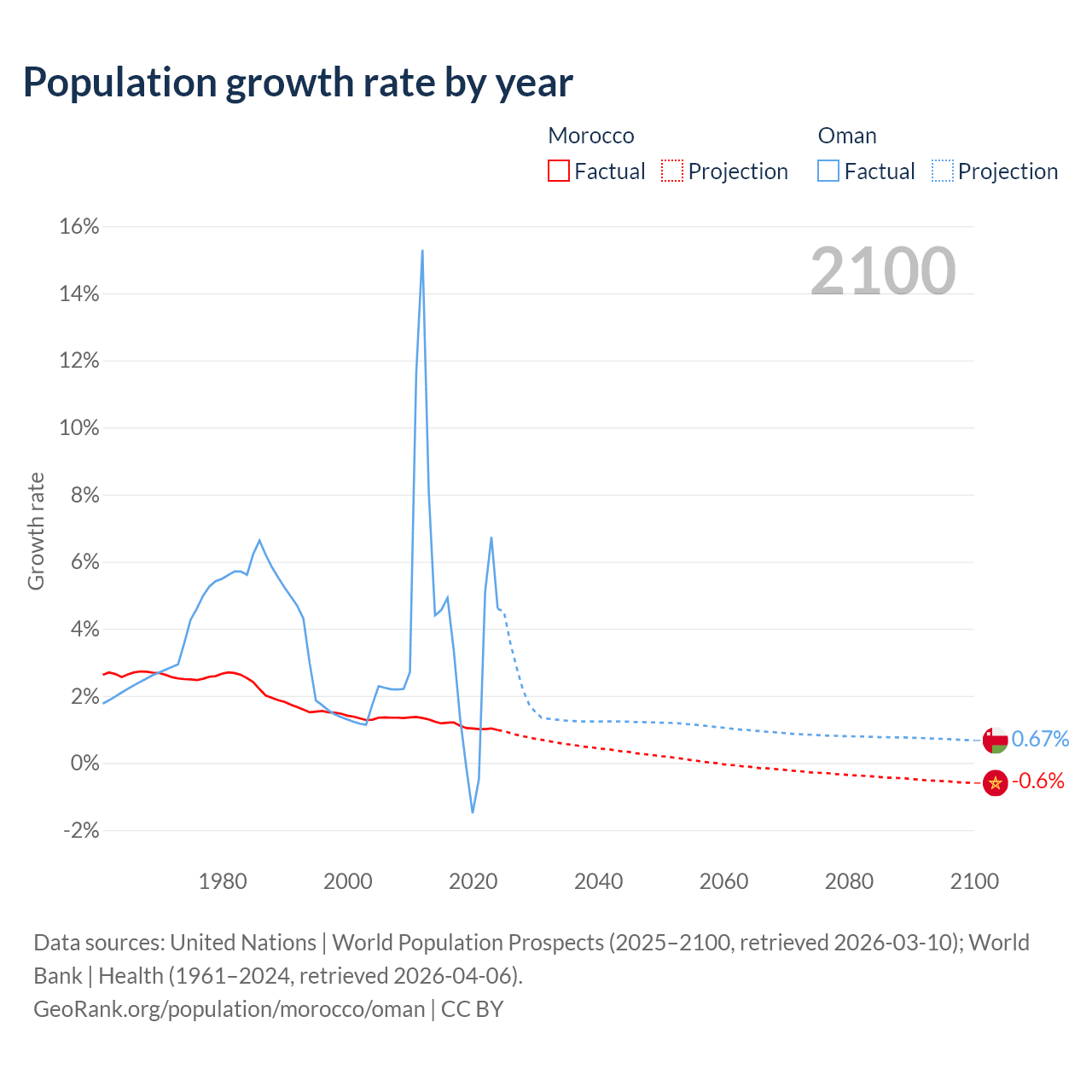 - For the last 10 years, Morocco has had an average growth rate of +1.09% per year vs +2.99% in Oman.