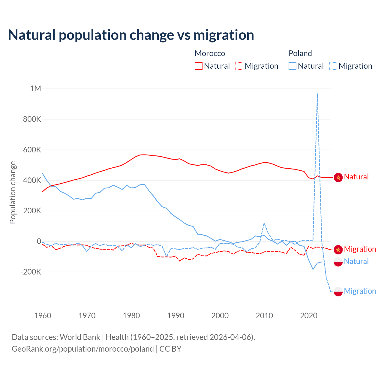 Over the last 10 years, 88.3% of the population change in Morocco is from natural causes (a gain of 4,495,223 people) and 11.7% is from migration (a loss of 594,083 people). In Poland 41.4% is from natural causes (a loss of 675,443 people) and 58.6% is from migration (a gain of 955,766 people).