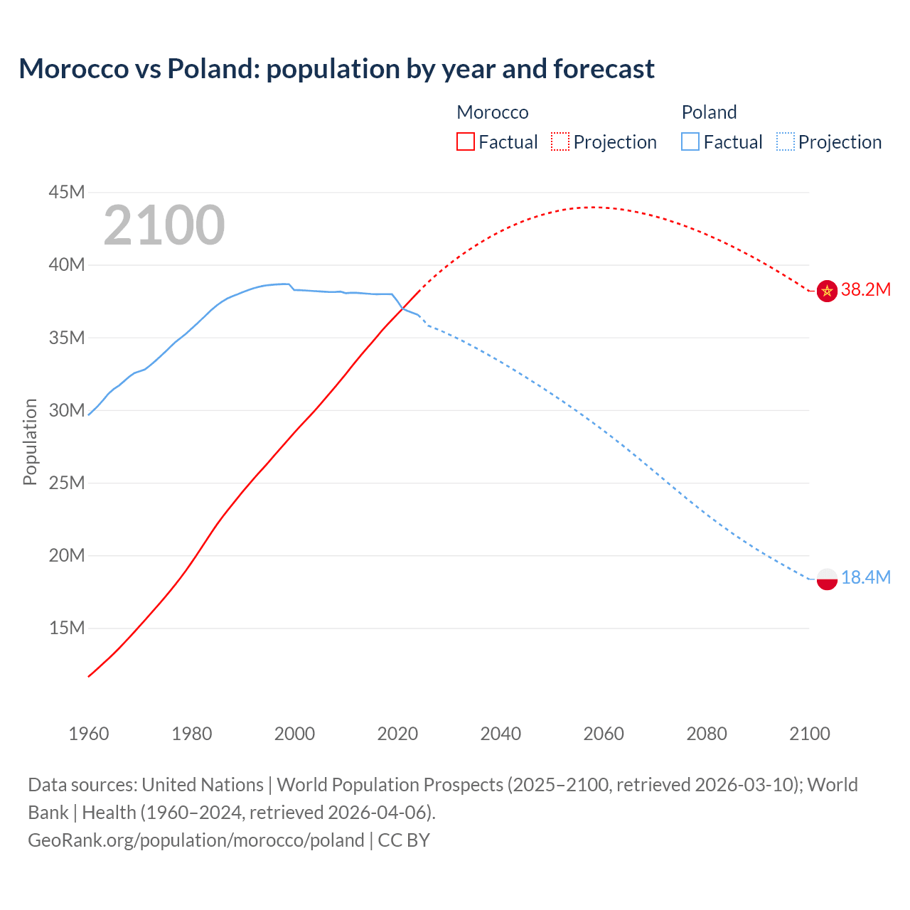 - Since 2006, the population of Morocco has increased from 30.8M people to 38.9M (26.3% growth), while Poland has declined from 38.1M to 35.8M (6.12% decline).