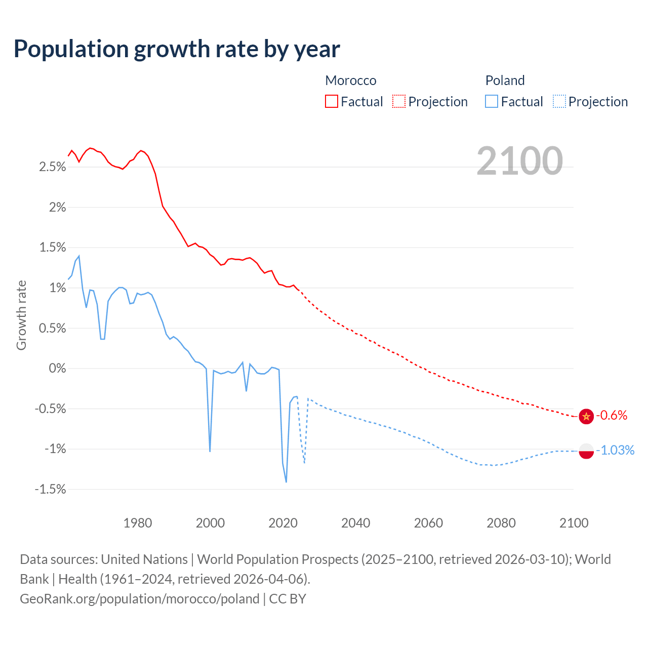 - For the last 10 years, Morocco has had an average growth rate of +1.09% per year vs -0.36% in Poland.