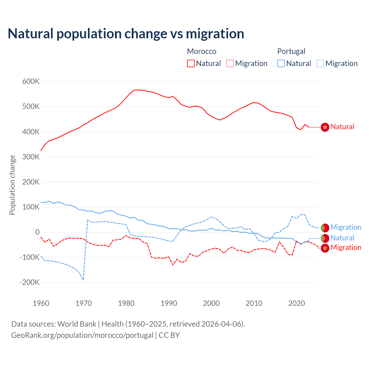 Over the last 10 years, 88.3% of the population change in Morocco is from natural causes (a gain of 4,495,223 people) and 11.7% is from migration (a loss of 594,083 people). In Portugal 51% is from natural causes (a loss of 302,748 people) and 49% is from migration (a gain of 290,554 people).