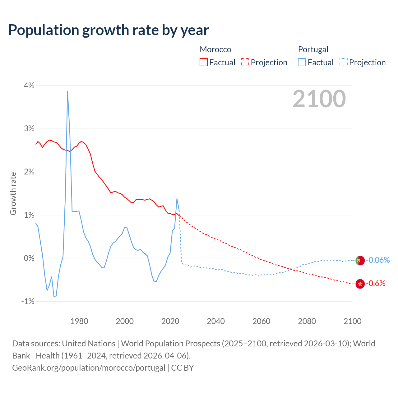 - For the last 10 years, Morocco has had an average growth rate of +1.09% per year vs +0.21% in Portugal.