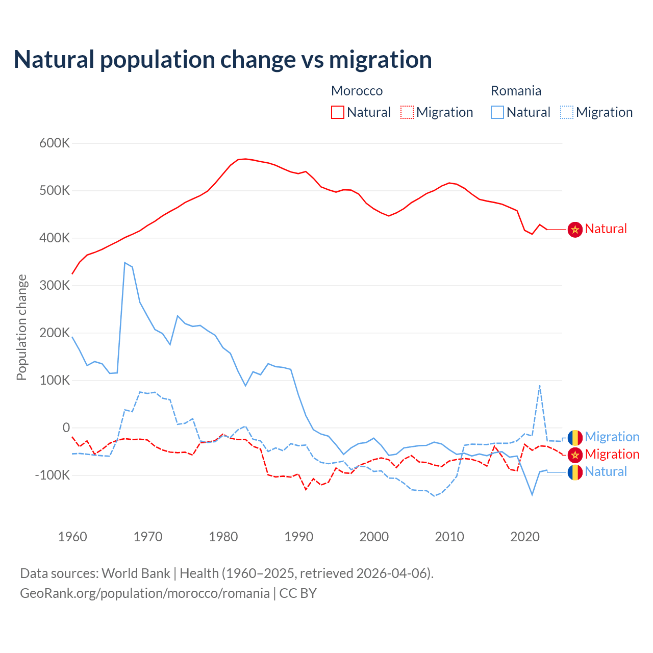 Over the last 10 years, 88.3% of the population change in Morocco is from natural causes (a gain of 4,495,223 people) and 11.7% is from migration (a loss of 594,083 people). In Romania 82% is from natural causes (a loss of 766,295 people) and 18% is from migration (a loss of 167,917 people).