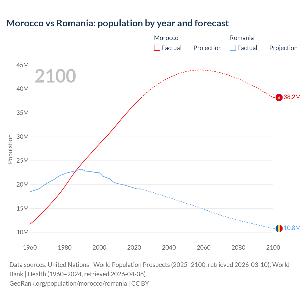 Morocco vs Romania: population by year and forecast