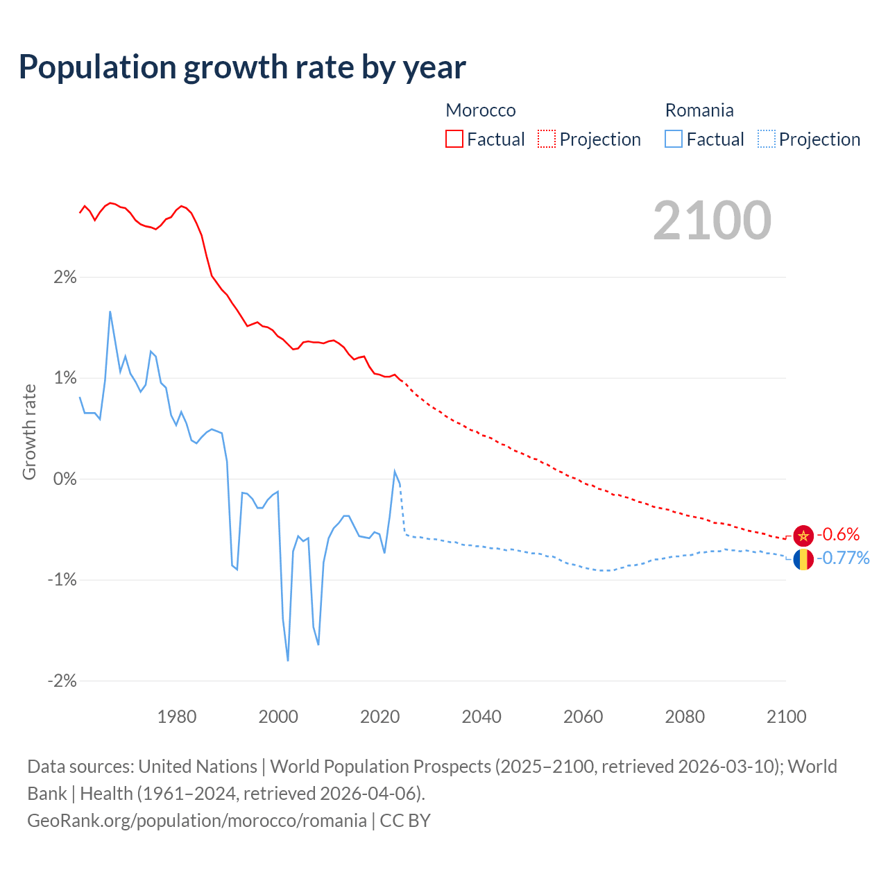 - For the last 10 years, Morocco has had an average growth rate of +1.09% per year vs -0.43% in Romania.