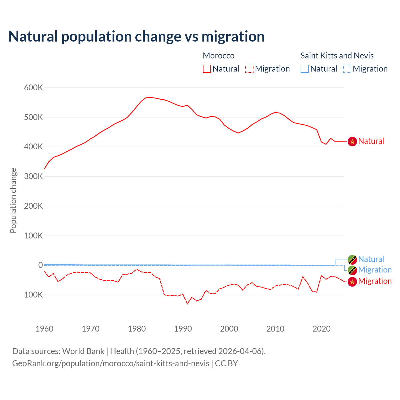 Over the last 10 years, 88.3% of the population change in Morocco is from natural causes (a gain of 4,495,223 people) and 11.7% is from migration (a loss of 594,083 people). In Saint Kitts and Nevis 44.9% is from natural causes (a gain of 1,225 people) and 55.1% is from migration (a loss of 1,506 people).