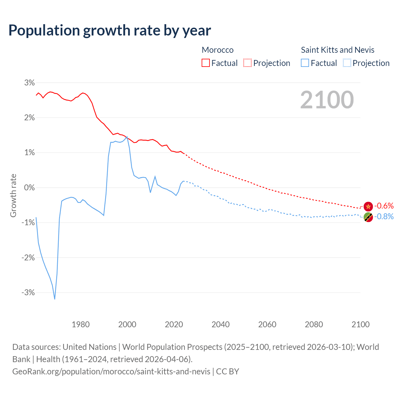 - For the last 10 years, Morocco has had an average growth rate of +1.09% per year vs -0.04% in Saint Kitts and Nevis.