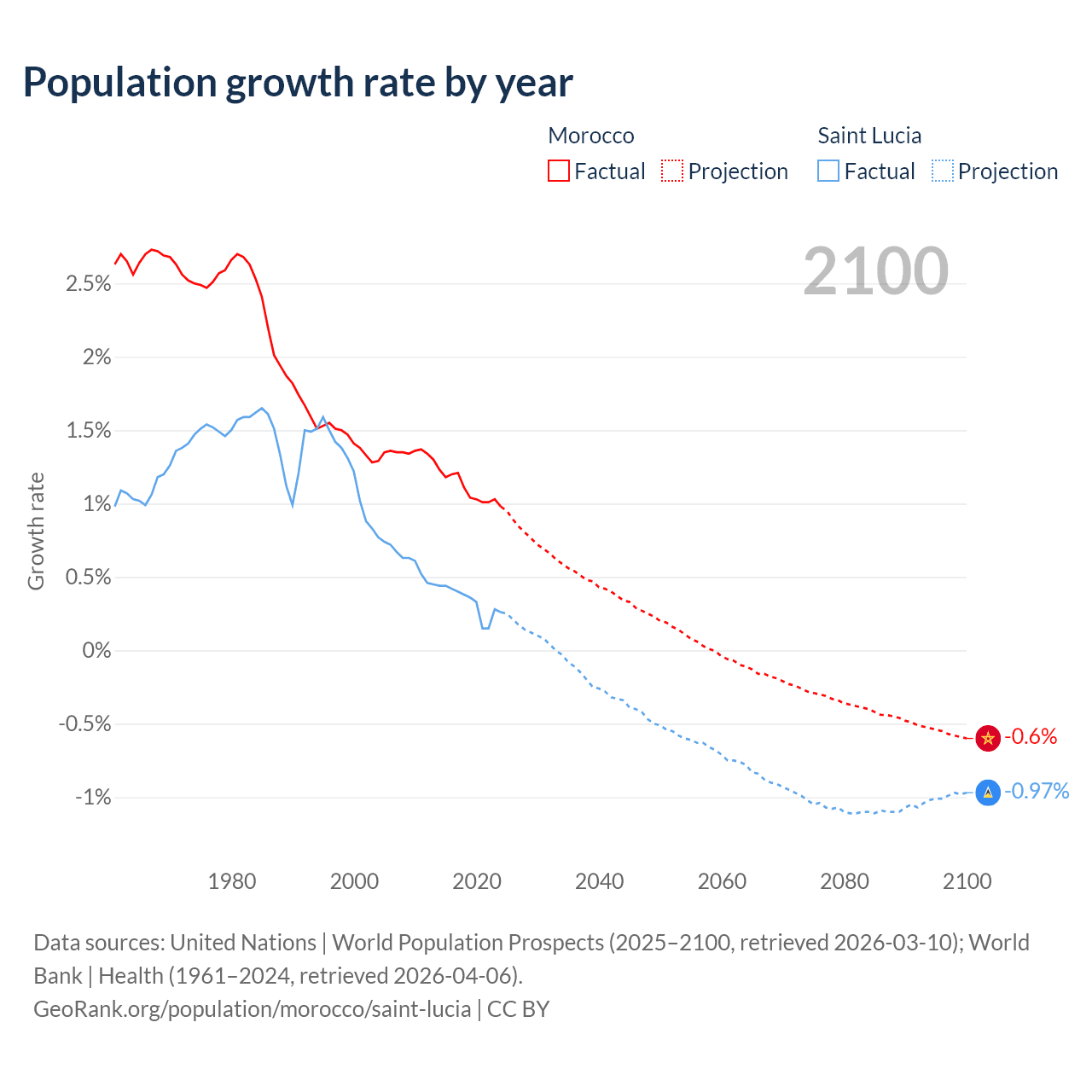 - For the last 10 years, Morocco has had an average growth rate of +1.09% per year vs +0.33% in Saint Lucia.