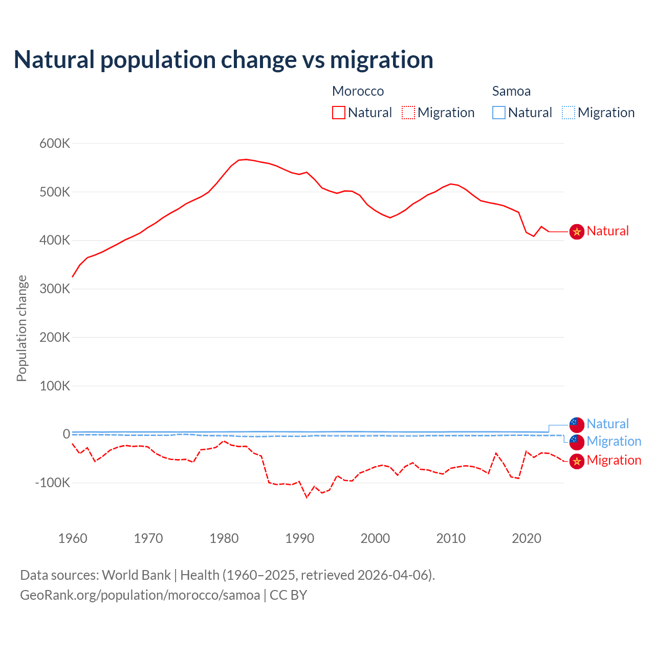 Over the last 10 years, 88.3% of the population change in Morocco is from natural causes (a gain of 4,495,223 people) and 11.7% is from migration (a loss of 594,083 people). In Samoa 62.5% is from natural causes (a gain of 45,436 people) and 37.5% is from migration (a loss of 27,246 people).