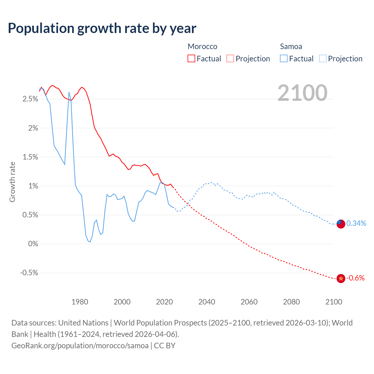 - For the last 10 years, Morocco has had an average growth rate of +1.09% per year vs +0.87% in Samoa.