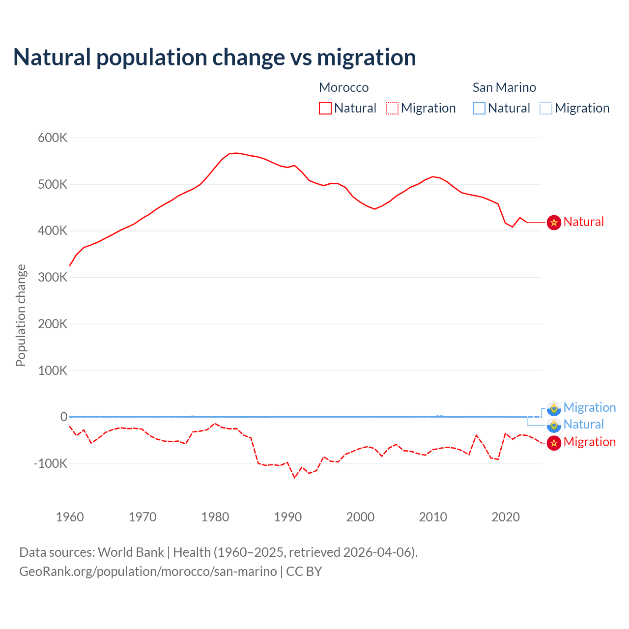 Over the last 10 years, 88.3% of the population change in Morocco is from natural causes (a gain of 4,495,223 people) and 11.7% is from migration (a loss of 594,083 people). In San Marino 40.9% is from natural causes (a loss of 358 people) and 59.1% is from migration (a gain of 517 people).