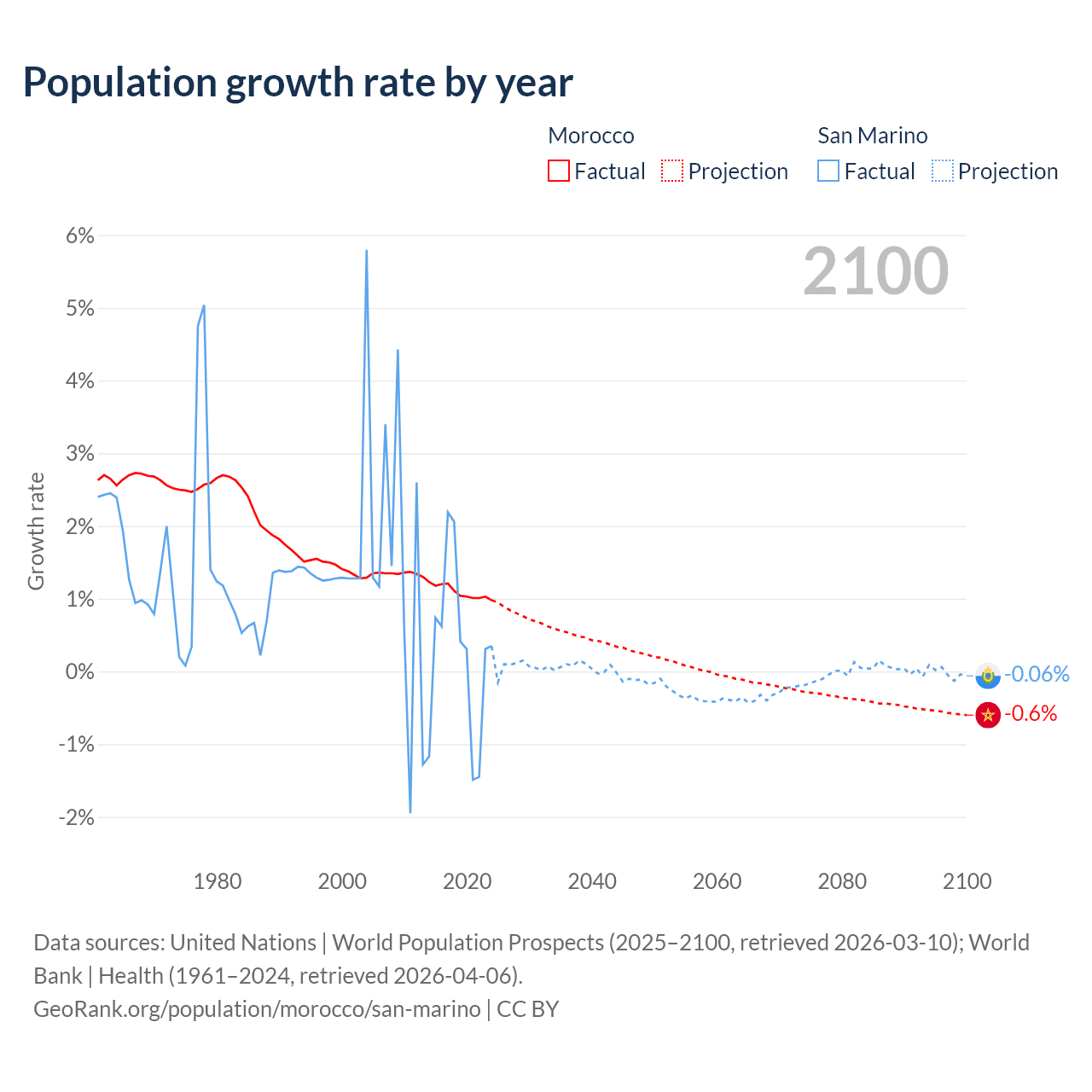 - For the last 10 years, Morocco has had an average growth rate of +1.09% per year vs +0.26% in San Marino.