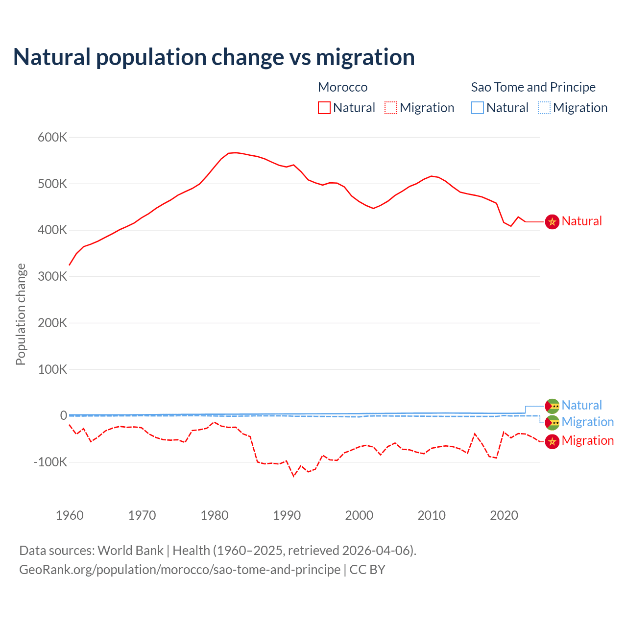 Over the last 10 years, 88.3% of the population change in Morocco is from natural causes (a gain of 4,495,223 people) and 11.7% is from migration (a loss of 594,083 people). In Sao Tome and Principe 80.1% is from natural causes (a gain of 50,822 people) and 19.9% is from migration (a loss of 12,621 people).