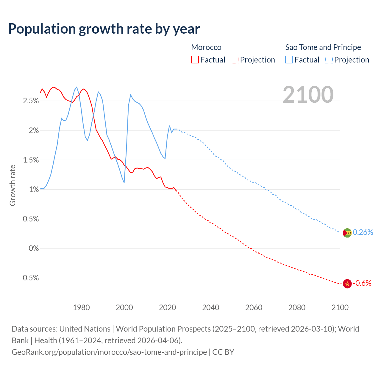 - For the last 10 years, Morocco has had an average growth rate of +1.09% per year vs +1.82% in Sao Tome and Principe.