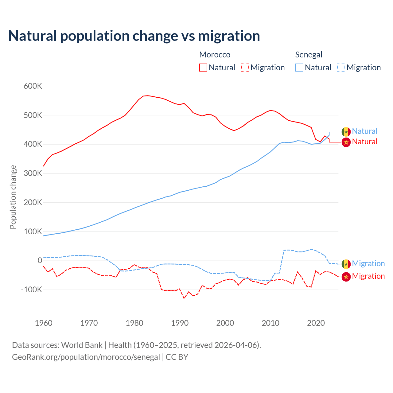 Over the last 10 years, 88.3% of the population change in Morocco is from natural causes (a gain of 4,495,223 people) and 11.7% is from migration (a loss of 594,083 people). In Senegal 93.9% is from natural causes (a gain of 4,089,205 people) and 6.13% is from migration (a gain of 267,266 people).