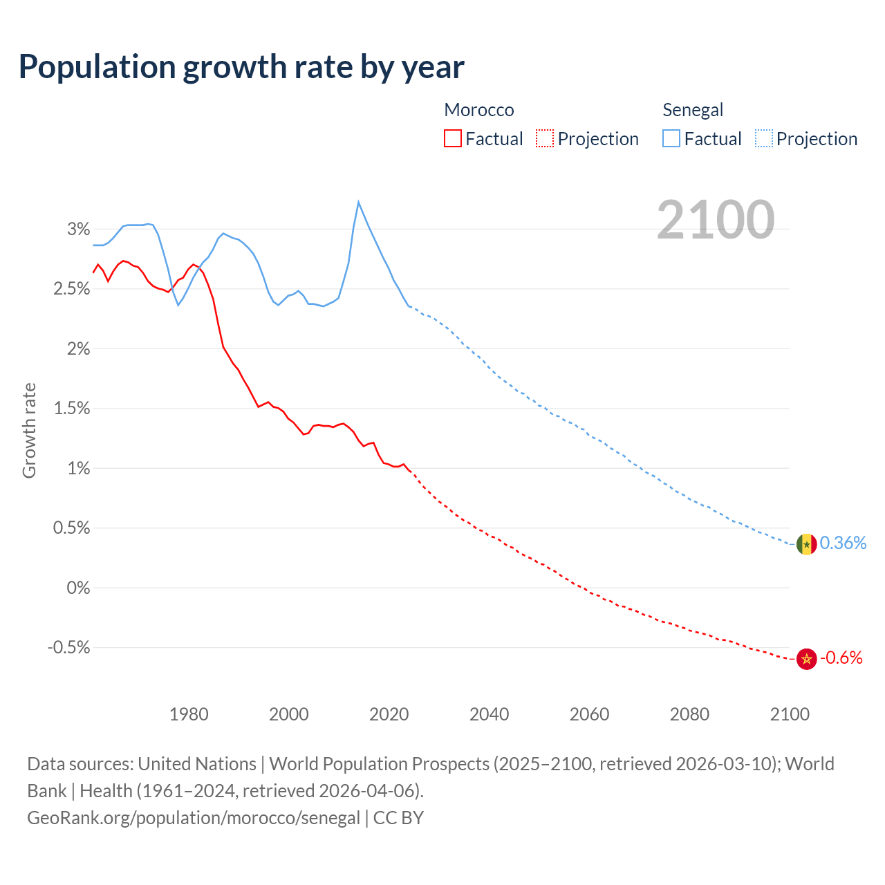 - For the last 10 years, Morocco has had an average growth rate of +1.09% per year vs +2.76% in Senegal.