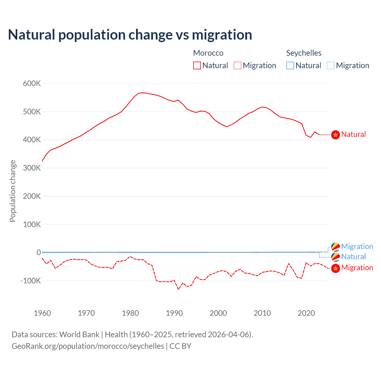 Over the last 10 years, 88.3% of the population change in Morocco is from natural causes (a gain of 4,495,223 people) and 11.7% is from migration (a loss of 594,083 people). In the Seychelles 31.4% is from natural causes (a gain of 8,122 people) and 68.6% is from migration (a gain of 17,748 people).