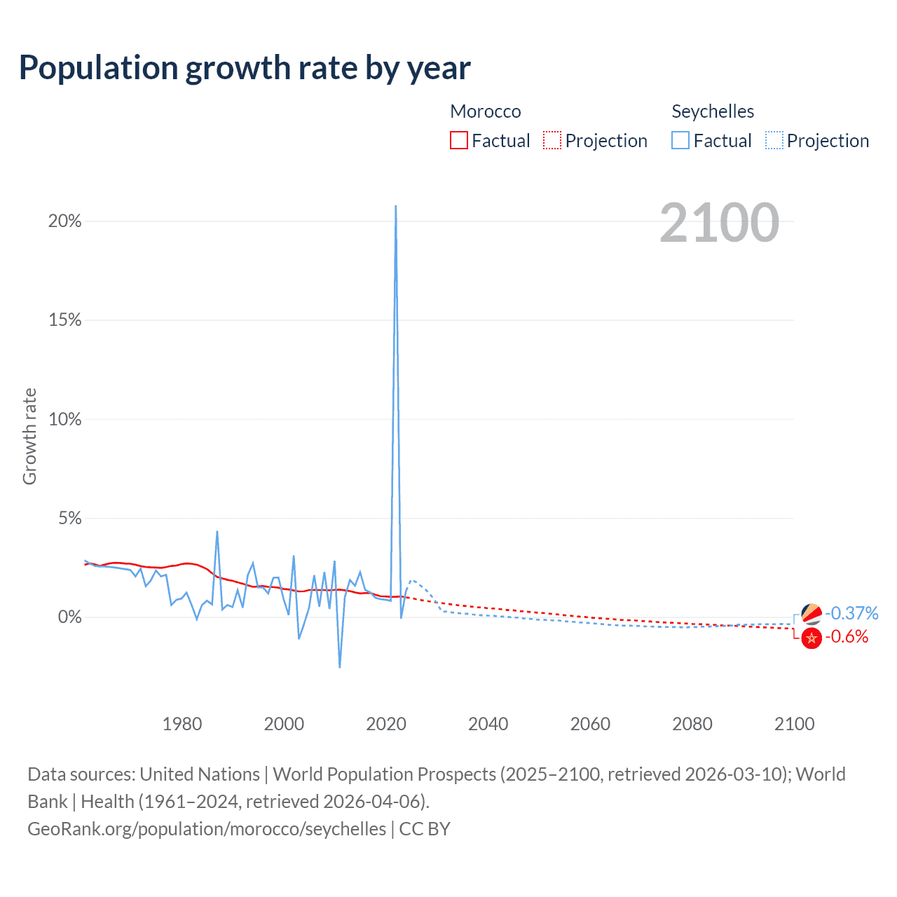 - For the last 10 years, Morocco has had an average growth rate of +1.09% per year vs +2.9% in the Seychelles.