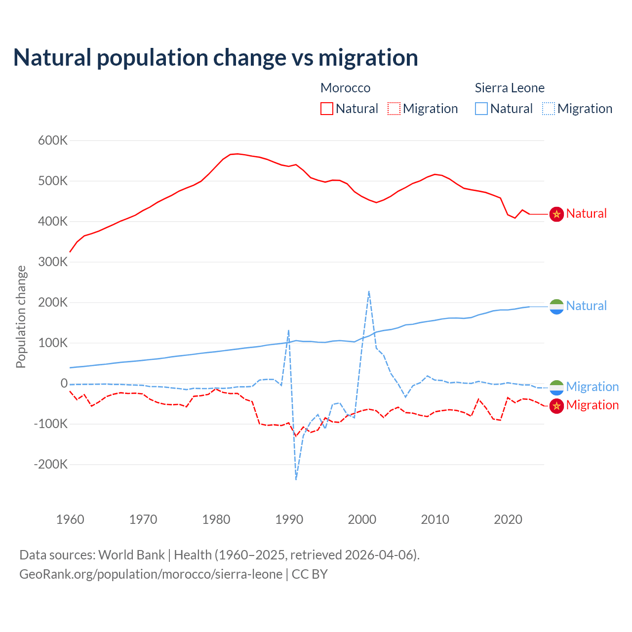 Over the last 10 years, 88.3% of the population change in Morocco is from natural causes (a gain of 4,495,223 people) and 11.7% is from migration (a loss of 594,083 people). In Sierra Leone 99.6% is from natural causes (a gain of 1,764,049 people) and 0.41% is from migration (a loss of 7,211 people).
