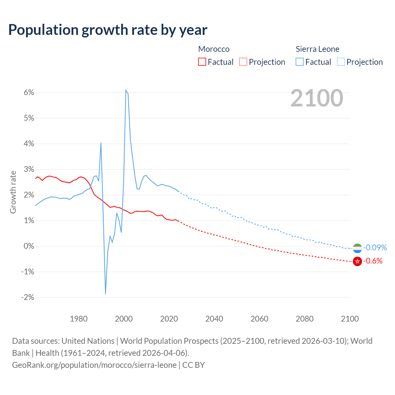 - For the last 10 years, Morocco has had an average growth rate of +1.09% per year vs +2.32% in Sierra Leone.