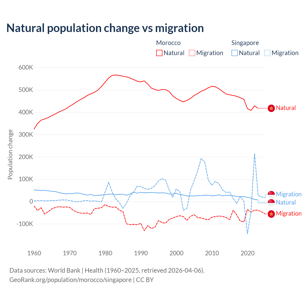 Over the last 10 years, 88.3% of the population change in Morocco is from natural causes (a gain of 4,495,223 people) and 11.7% is from migration (a loss of 594,083 people). In Singapore 54.8% is from natural causes (a gain of 195,953 people) and 45.2% is from migration (a gain of 161,805 people).