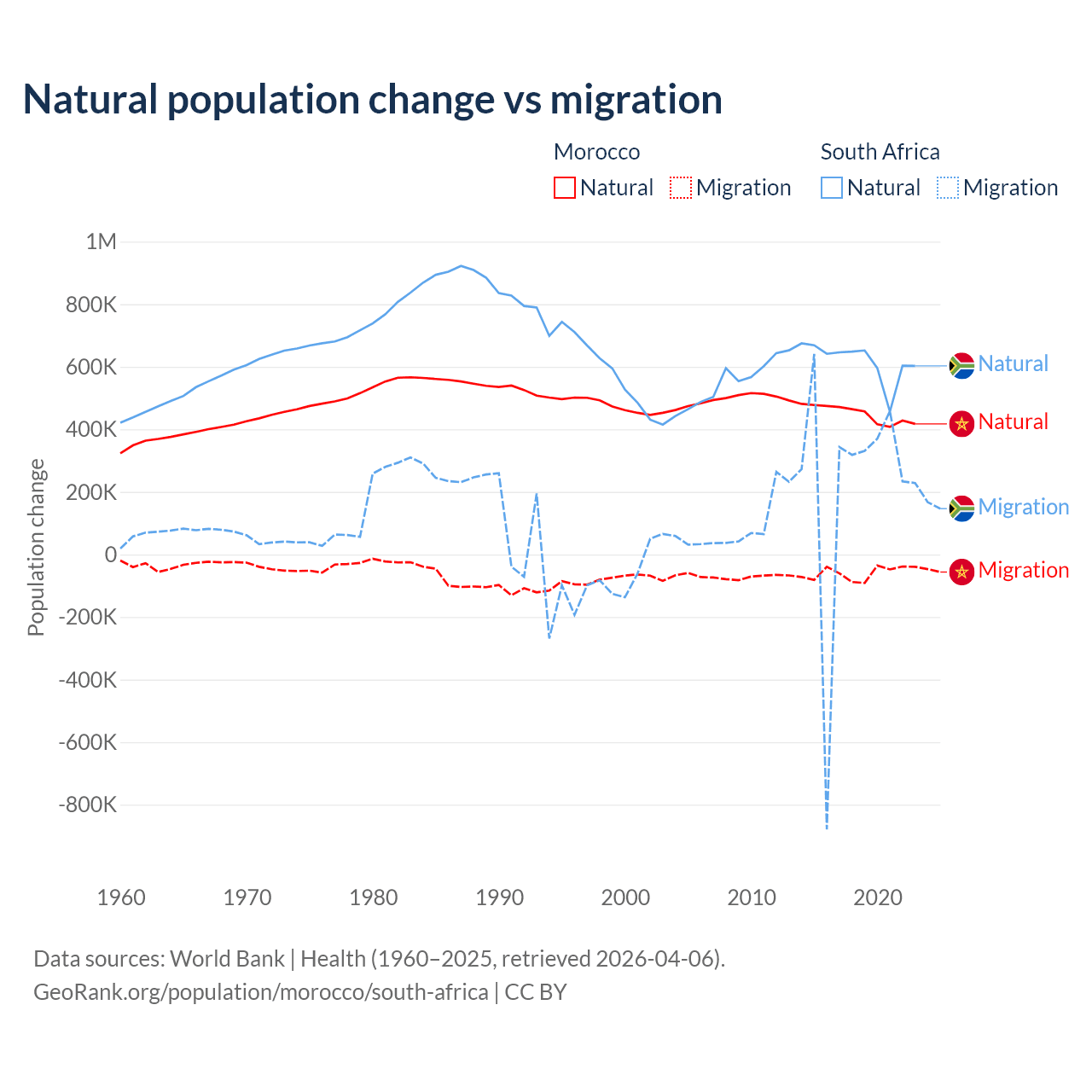 Over the last 10 years, 88.3% of the population change in Morocco is from natural causes (a gain of 4,495,223 people) and 11.7% is from migration (a loss of 594,083 people). In South Africa 72.8% is from natural causes (a gain of 6,190,027 people) and 27.2% is from migration (a gain of 2,316,795 people).