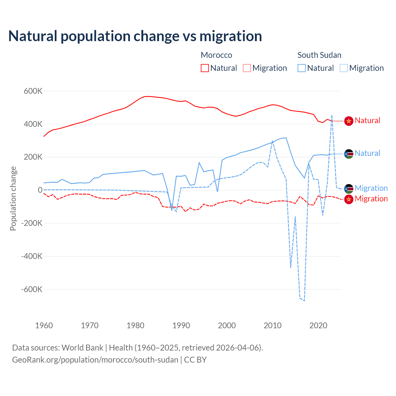 Over the last 10 years, 88.3% of the population change in Morocco is from natural causes (a gain of 4,495,223 people) and 11.7% is from migration (a loss of 594,083 people). In South Sudan 57.4% is from natural causes (a gain of 1,792,135 people) and 42.6% is from migration (a loss of 1,329,606 people).