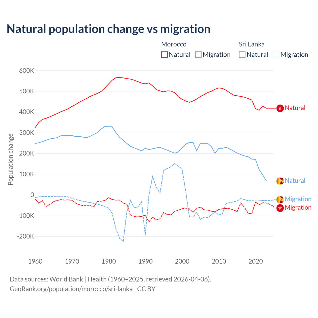 Over the last 10 years, 88.3% of the population change in Morocco is from natural causes (a gain of 4,495,223 people) and 11.7% is from migration (a loss of 594,083 people). In Sri Lanka 85.3% is from natural causes (a gain of 1,605,749 people) and 14.7% is from migration (a loss of 276,121 people).
