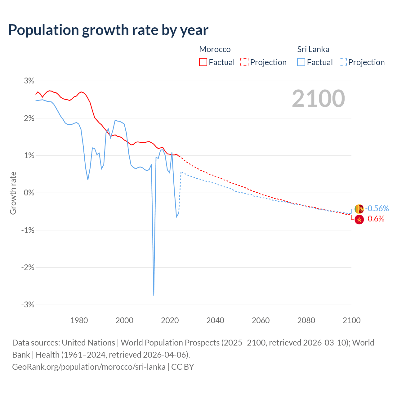 - For the last 10 years, Morocco has had an average growth rate of +1.09% per year vs +0.57% in Sri Lanka.