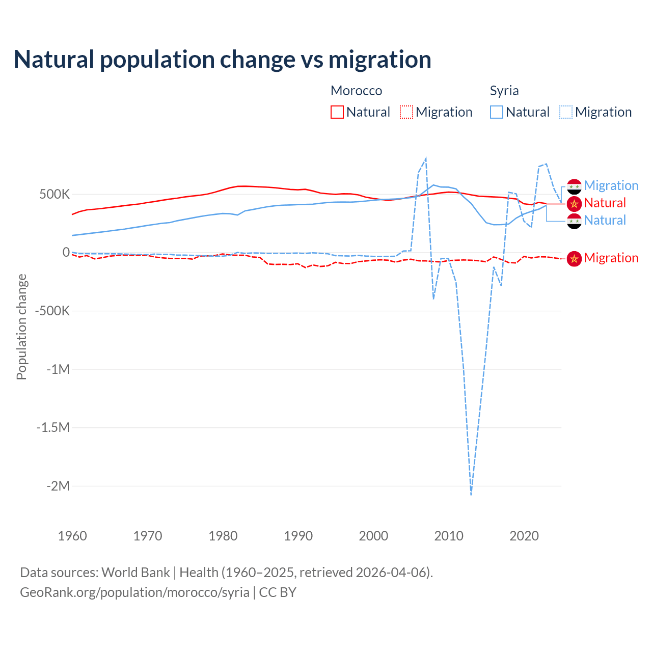Over the last 10 years, 88.3% of the population change in Morocco is from natural causes (a gain of 4,495,223 people) and 11.7% is from migration (a loss of 594,083 people). In Syria 91.3% is from natural causes (a gain of 3,047,621 people) and 8.72% is from migration (a gain of 291,069 people).