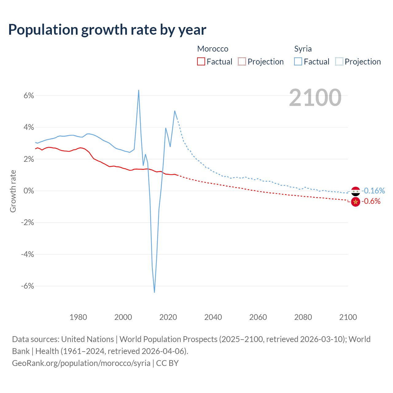 - For the last 10 years, Morocco has had an average growth rate of +1.09% per year vs +1.25% in Syria.