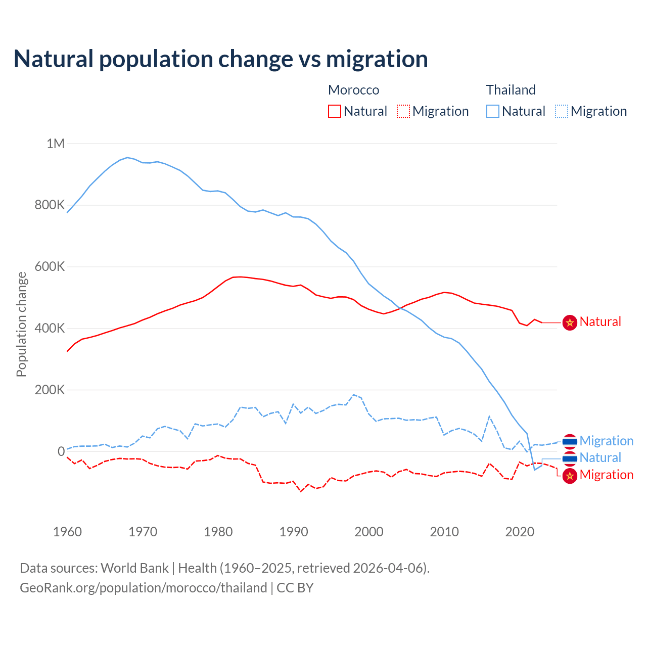 Over the last 10 years, 88.3% of the population change in Morocco is from natural causes (a gain of 4,495,223 people) and 11.7% is from migration (a loss of 594,083 people). In Thailand 78.4% is from natural causes (a gain of 1,292,528 people) and 21.6% is from migration (a gain of 355,361 people).