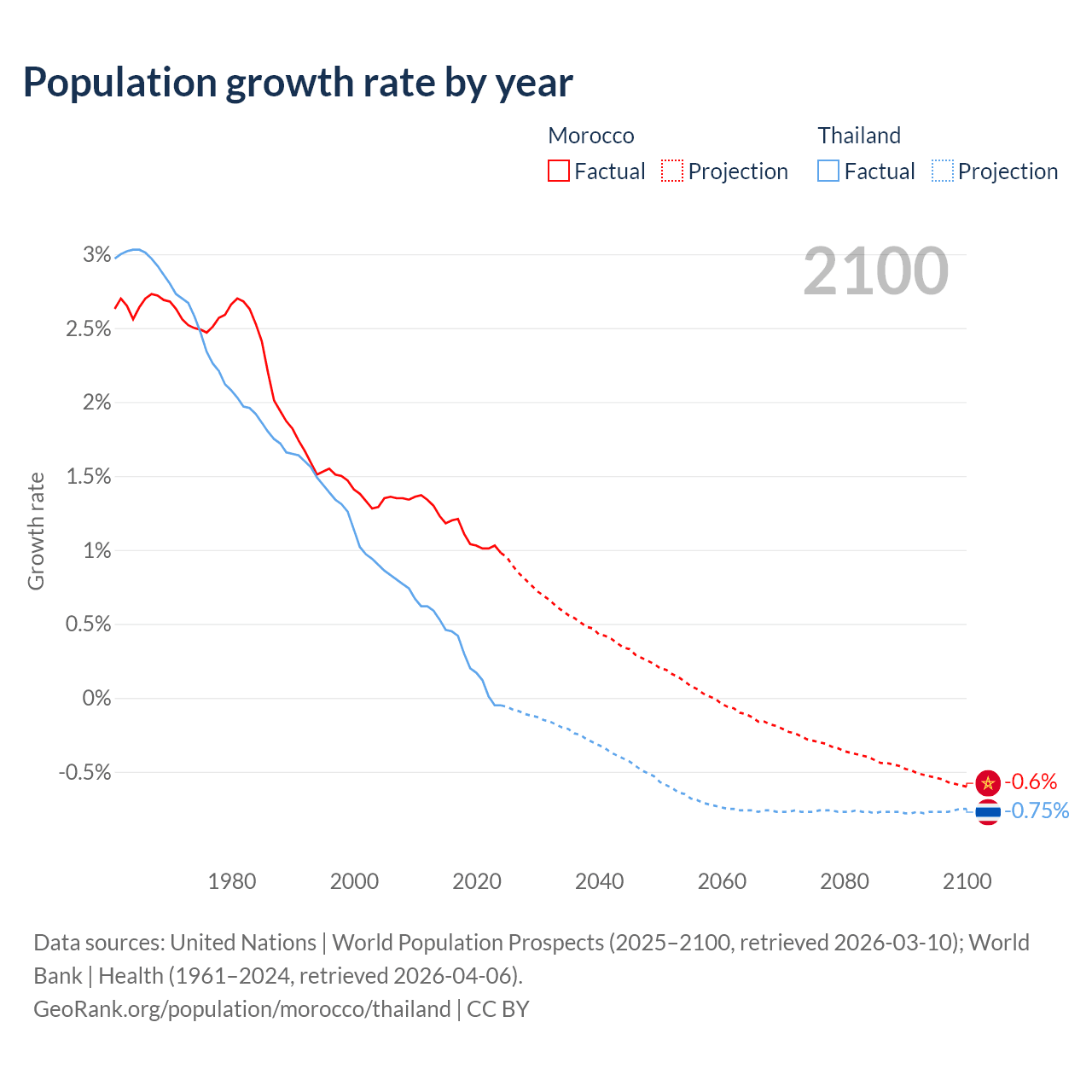 - For the last 10 years, Morocco has had an average growth rate of +1.09% per year vs +0.23% in Thailand.