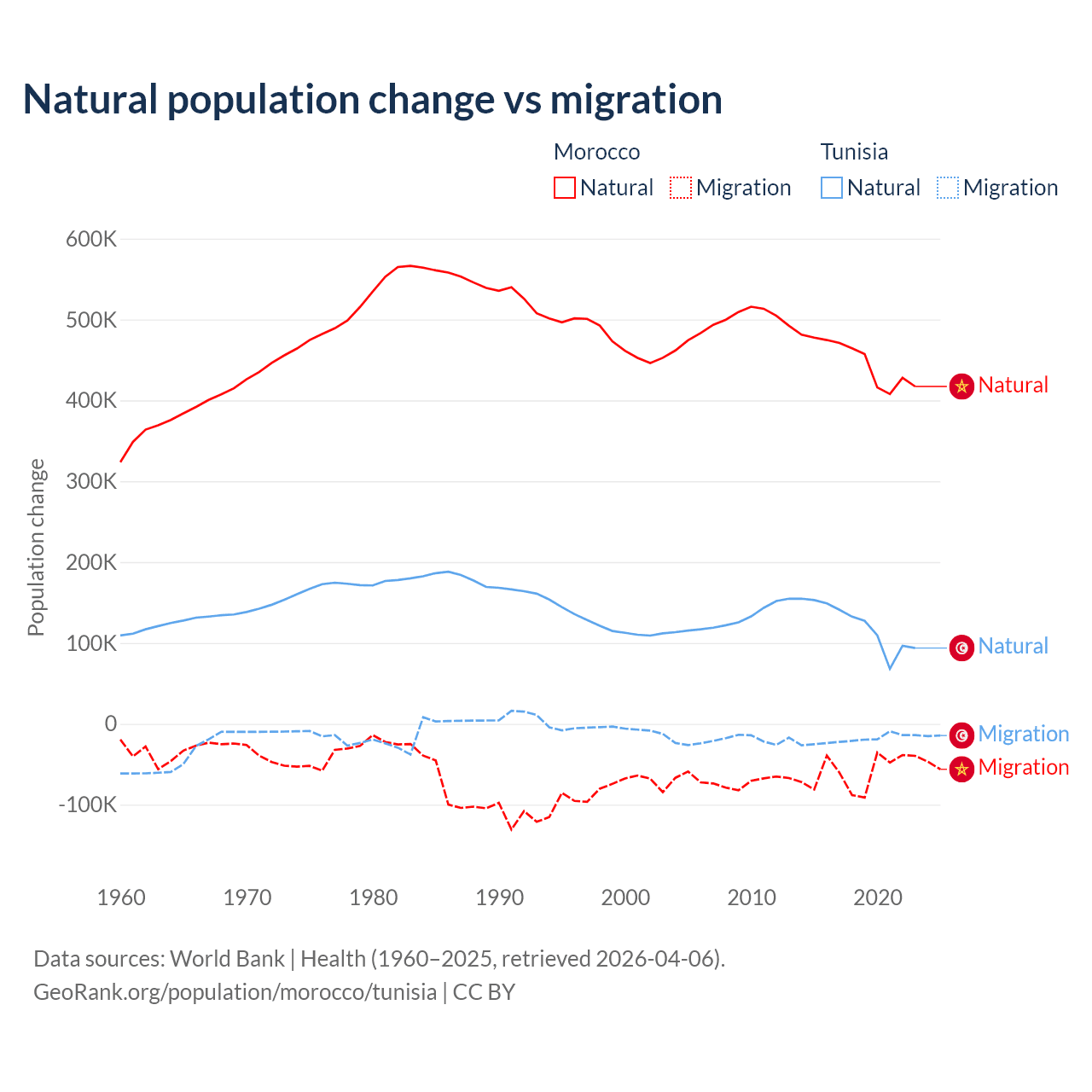 Over the last 10 years, 88.3% of the population change in Morocco is from natural causes (a gain of 4,495,223 people) and 11.7% is from migration (a loss of 594,083 people). In Tunisia 86.3% is from natural causes (a gain of 1,225,079 people) and 13.7% is from migration (a loss of 195,011 people).