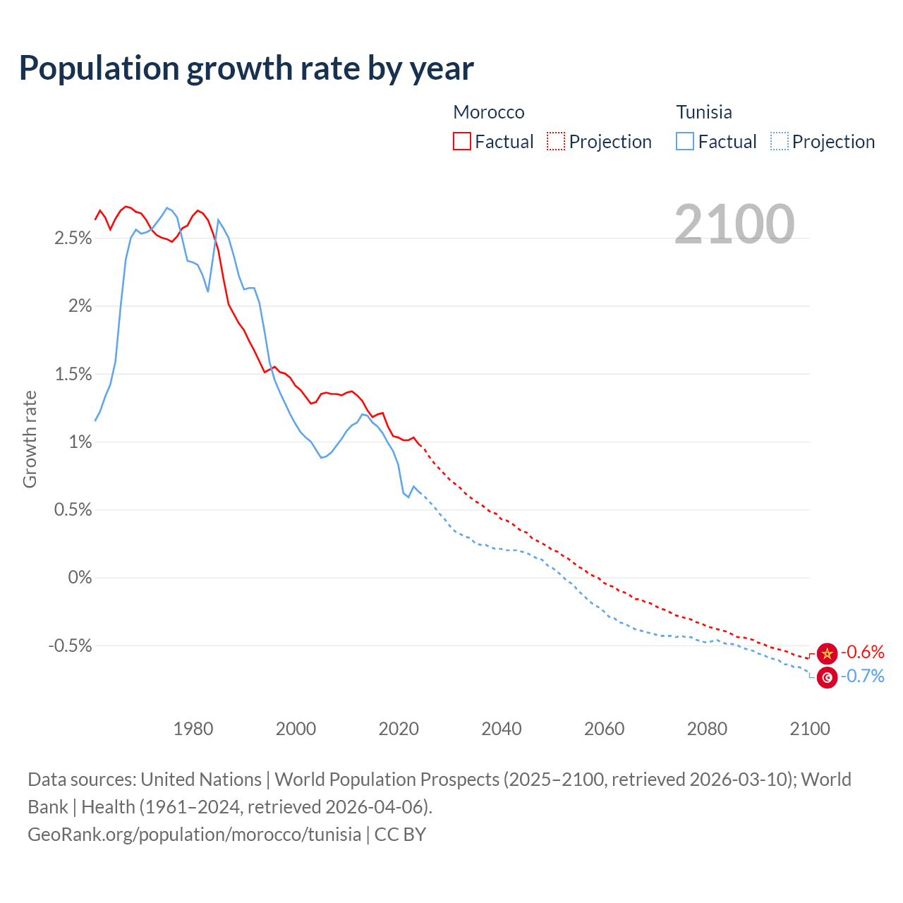 - For the last 10 years, Morocco has had an average growth rate of +1.09% per year vs +0.89% in Tunisia.