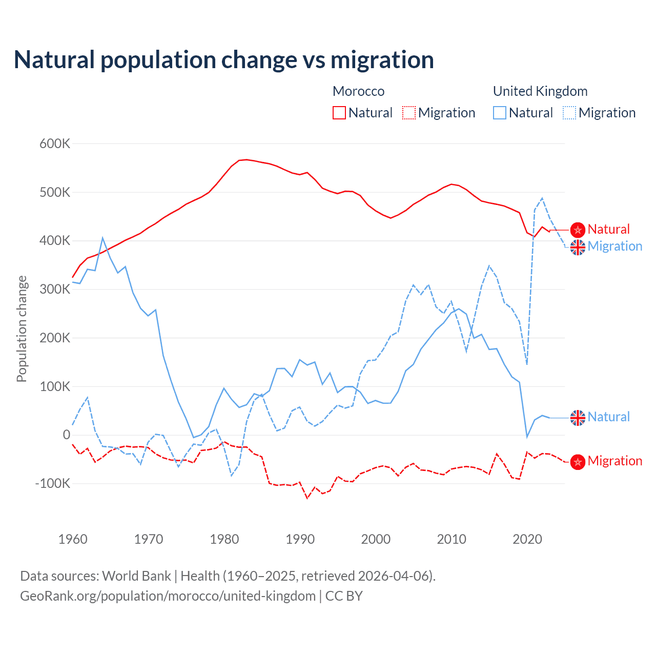 Over the last 10 years, 88.3% of the population change in Morocco is from natural causes (a gain of 4,495,223 people) and 11.7% is from migration (a loss of 594,083 people). In the United Kingdom 23.9% is from natural causes (a gain of 1,033,129 people) and 76.1% is from migration (a gain of 3,283,101 people).