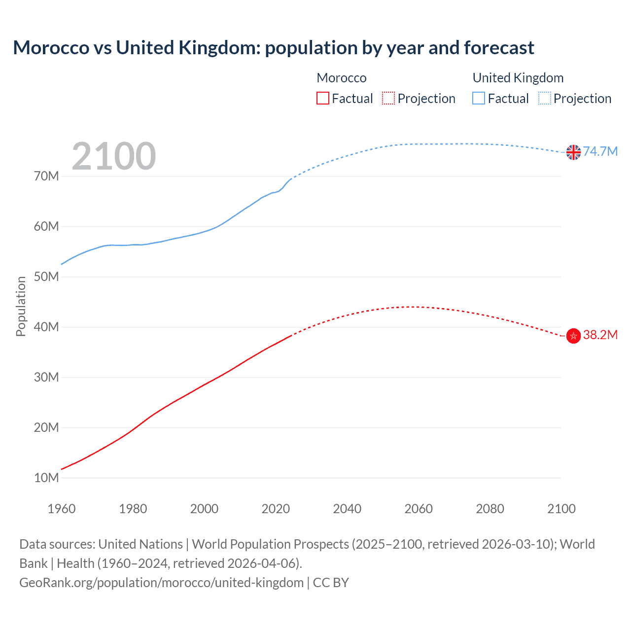 The latest officially reported population of Morocco was 38,081,173 in 2024 vs 69,226,000 people in the United Kingdom in 2024. In 2026, based on the adjusted UN estimation, the current Morocco's population is 38,871,720 people compared to 70,154,914 in the United Kingdom.