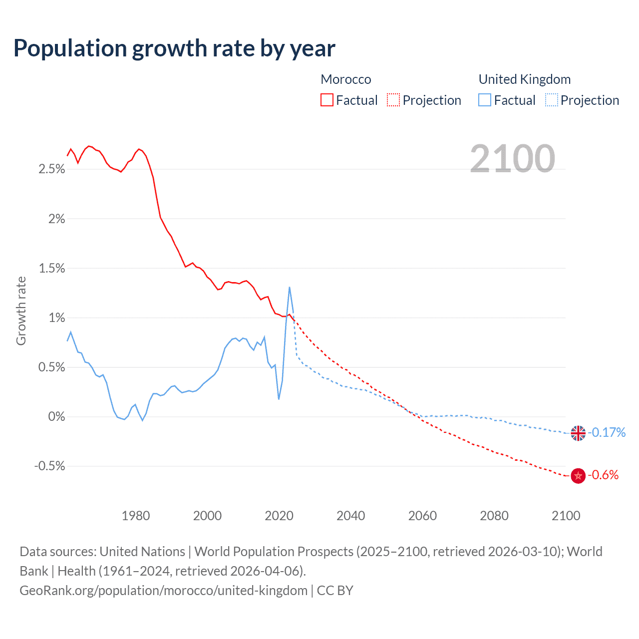 - For the last 10 years, Morocco has had an average growth rate of +1.09% per year vs +0.7% in the United Kingdom.