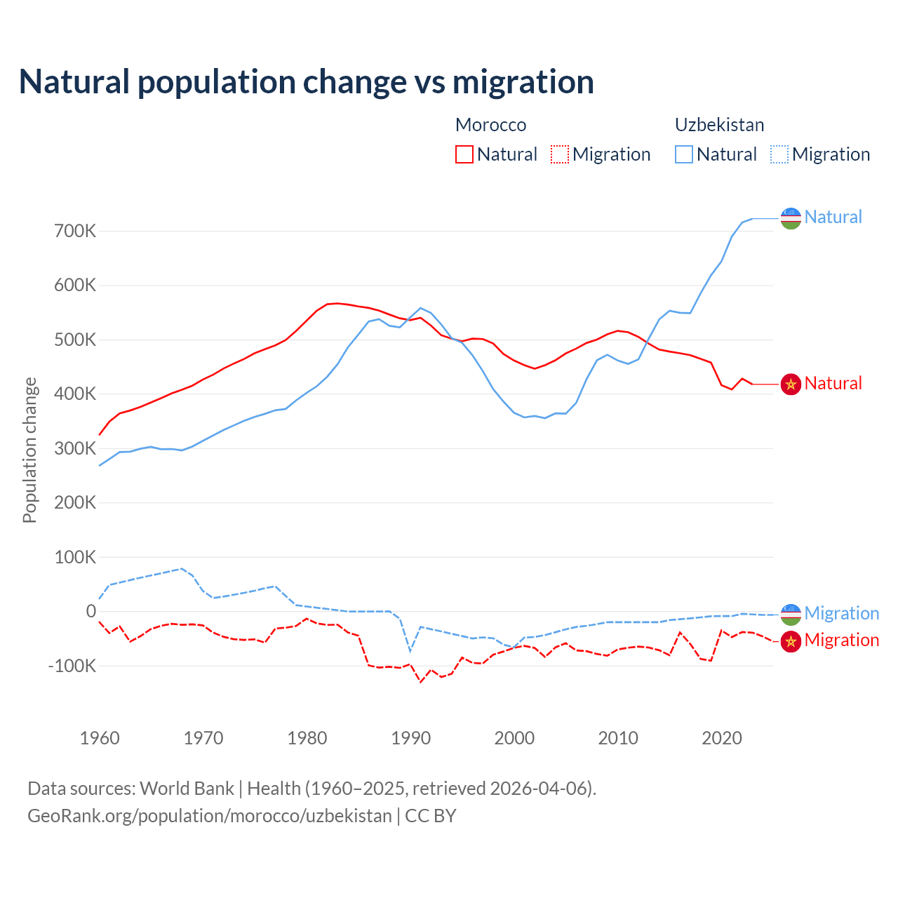Over the last 10 years, 88.3% of the population change in Morocco is from natural causes (a gain of 4,495,223 people) and 11.7% is from migration (a loss of 594,083 people). In Uzbekistan 98.2% is from natural causes (a gain of 6,161,117 people) and 1.84% is from migration (a loss of 115,398 people).