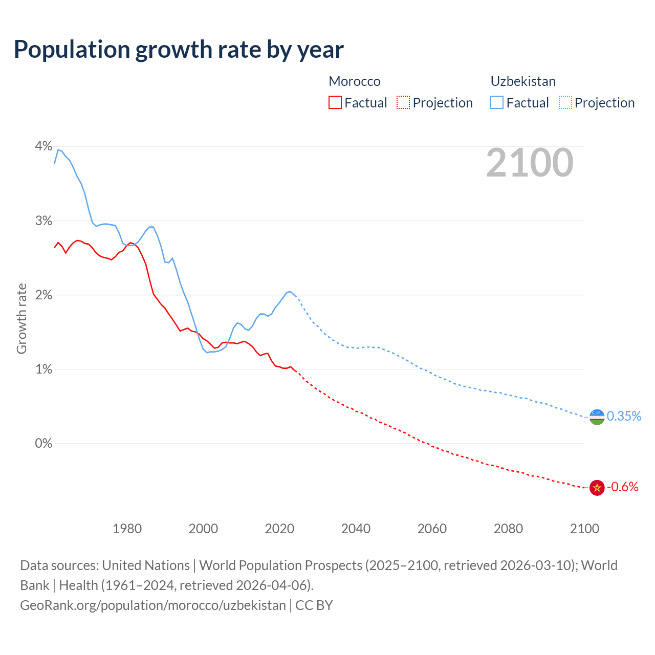 - For the last 10 years, Morocco has had an average growth rate of +1.09% per year vs +1.85% in Uzbekistan.