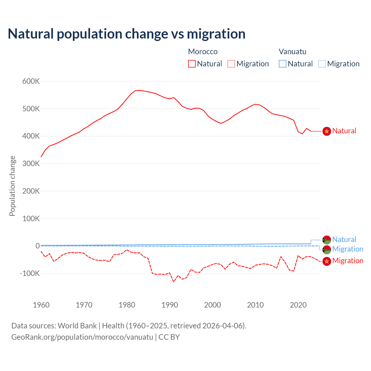 Over the last 10 years, 88.3% of the population change in Morocco is from natural causes (a gain of 4,495,223 people) and 11.7% is from migration (a loss of 594,083 people). In Vanuatu 92.2% is from natural causes (a gain of 72,941 people) and 7.81% is from migration (a loss of 6,181 people).