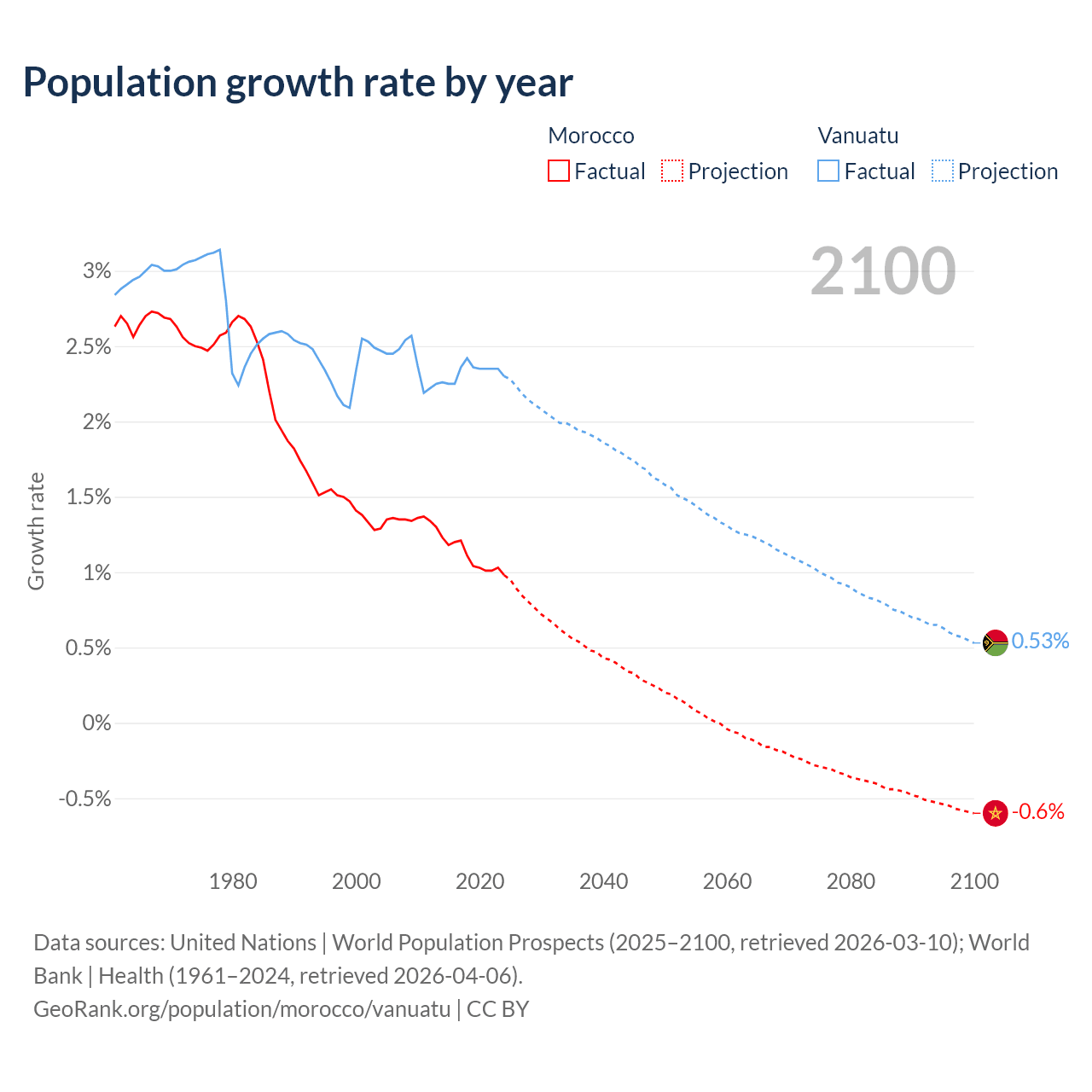 - For the last 10 years, Morocco has had an average growth rate of +1.09% per year vs +2.33% in Vanuatu.