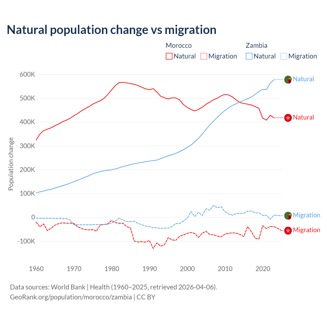 Over the last 10 years, 88.3% of the population change in Morocco is from natural causes (a gain of 4,495,223 people) and 11.7% is from migration (a loss of 594,083 people). In Zambia 97.4% is from natural causes (a gain of 5,233,797 people) and 2.58% is from migration (a gain of 138,554 people).