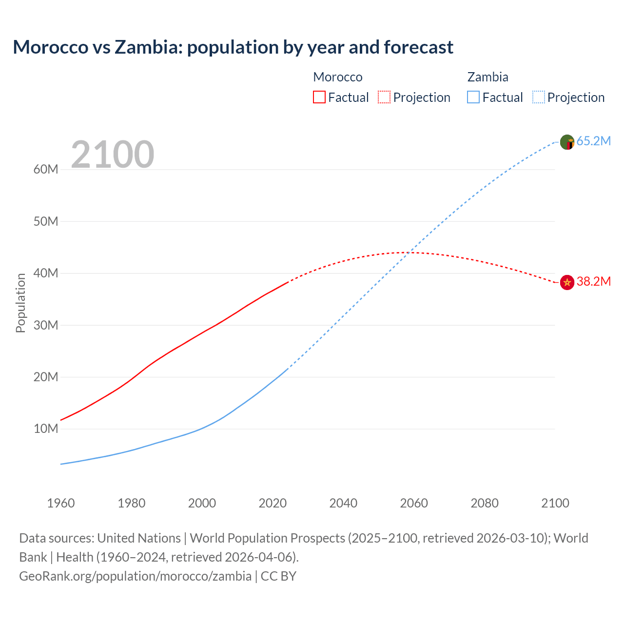 The latest officially reported population of Morocco was 38,081,173 in 2024 vs 21,314,956 people in Zambia in 2024. In 2026, based on the adjusted UN estimation, the current Morocco's population is 38,871,720 people compared to 22,697,916 in Zambia.