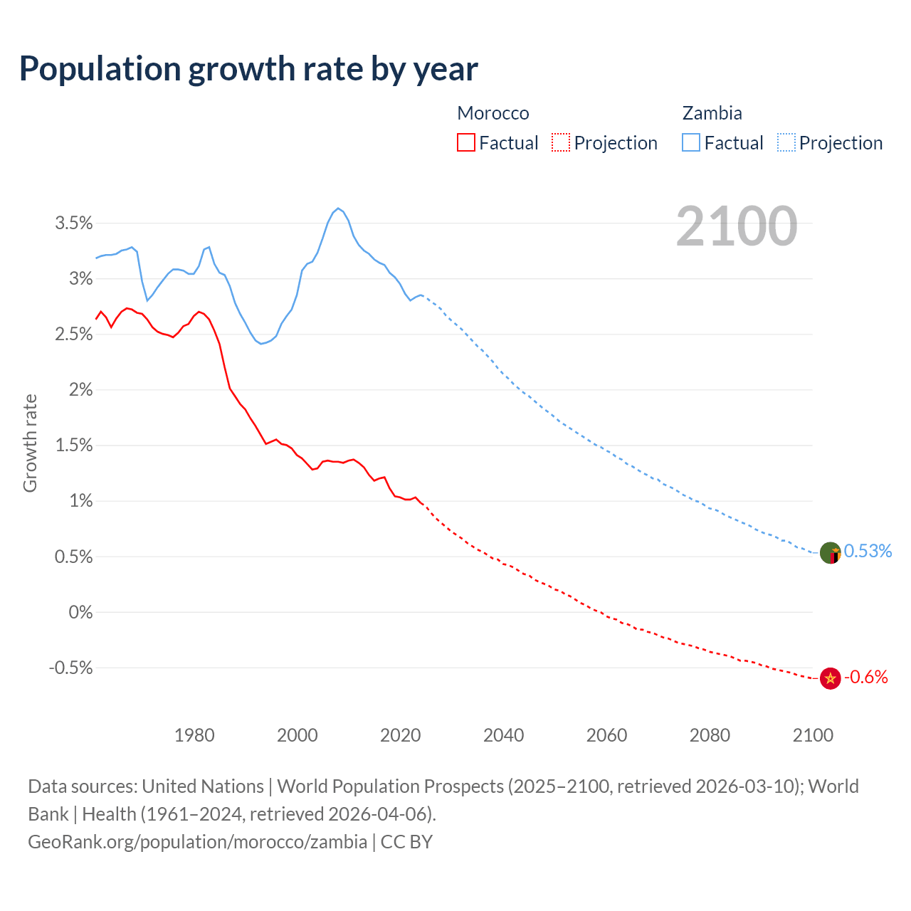 - For the last 10 years, Morocco has had an average growth rate of +1.09% per year vs +3% in Zambia.