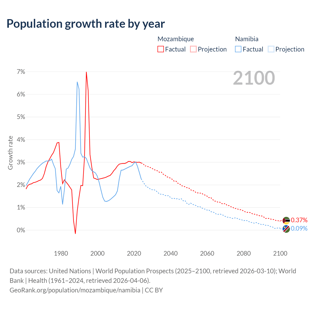 - For the last 10 years, Mozambique has had an average growth rate of +2.99% per year vs +2.73% in Namibia.