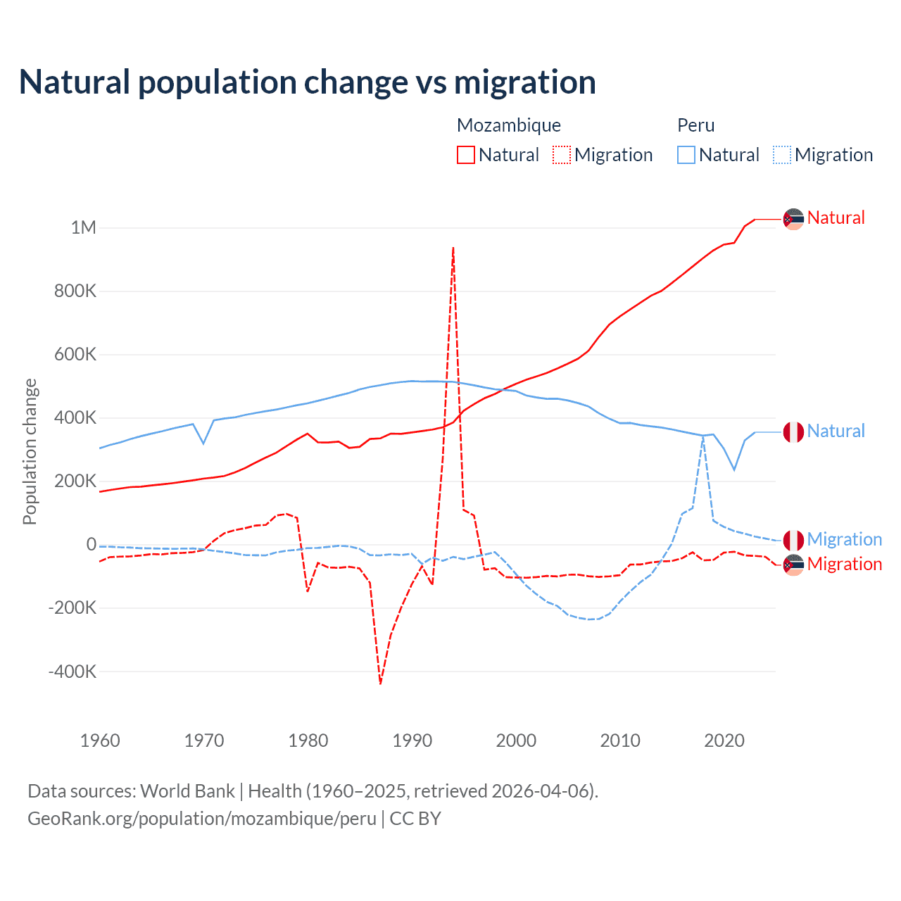 Over the last 10 years, 95.9% of the population change in Mozambique is from natural causes (a gain of 9,108,203 people) and 4.15% is from migration (a loss of 393,923 people). In Peru 82% is from natural causes (a gain of 3,345,822 people) and 18% is from migration (a gain of 732,505 people).