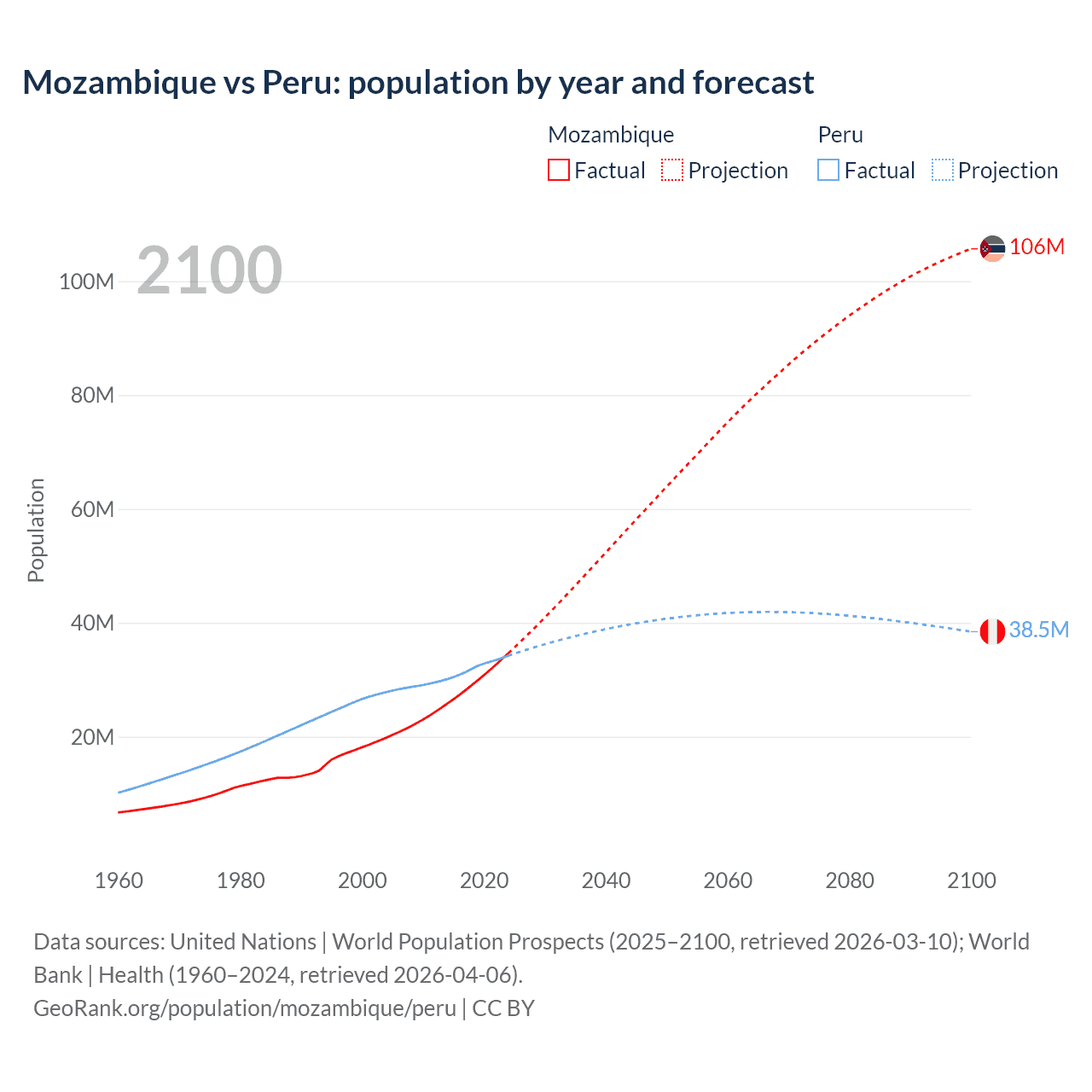 The latest officially reported population of Mozambique was 34,631,766 in 2024 vs 34,217,848 people in Peru in 2024. In 2026, based on the adjusted UN estimation, the current Mozambique's population is 36,941,128 people compared to 35,031,596 in Peru.